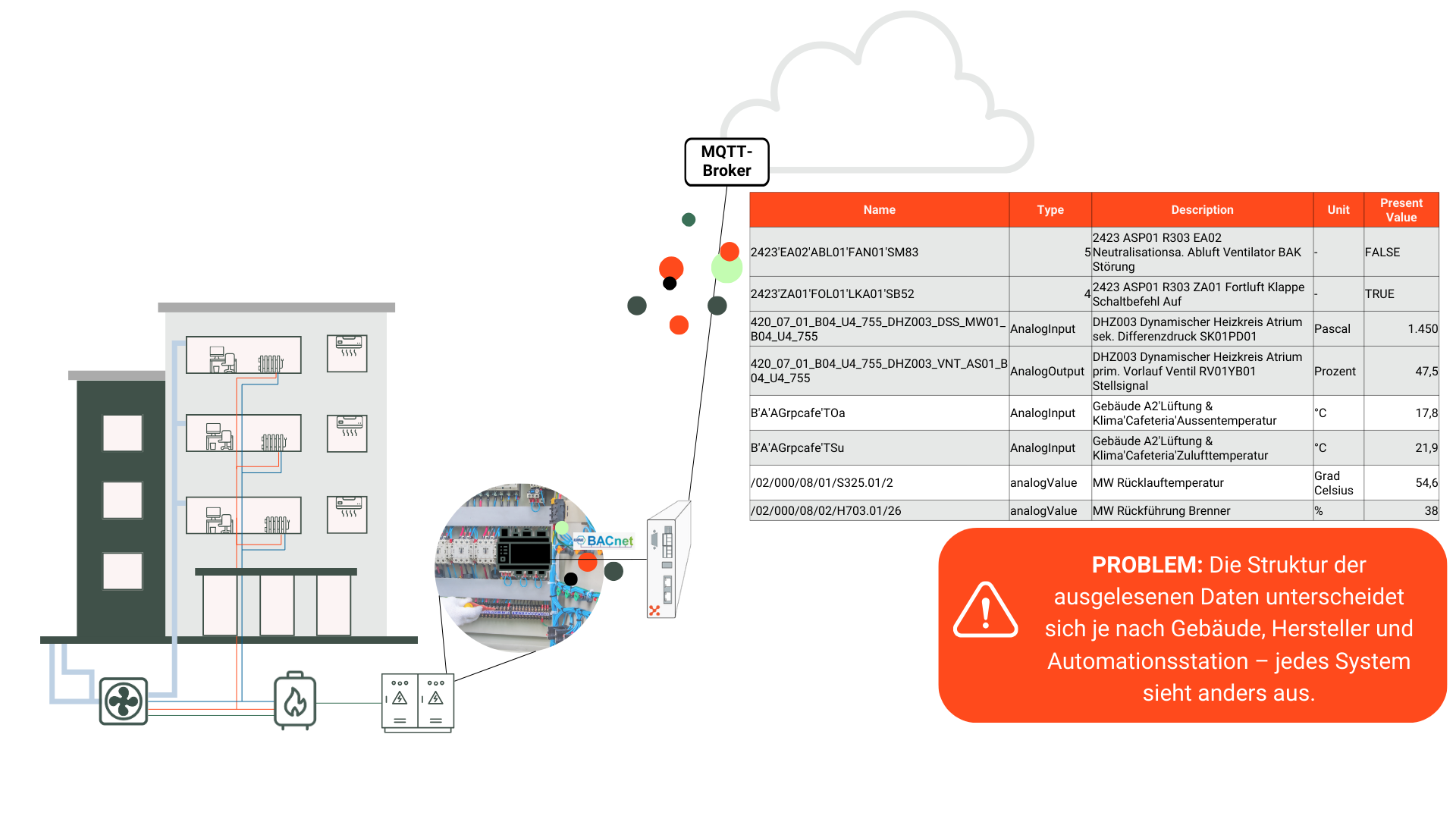 Bestandsgebäude nutzen eine Vielzahl unterschiedlicher Protokolle wie BACnet, Modbus oder KNX. Dazu kommen Hersteller-spezifische Systeme und uneinheitliche Benennungen. Ein und derselbe Wert kann etwa als „VL_Temp“, „FlowTemp“ oder „T_VL“ auftauchen – teils sogar mit unterschiedlichen Einheiten.